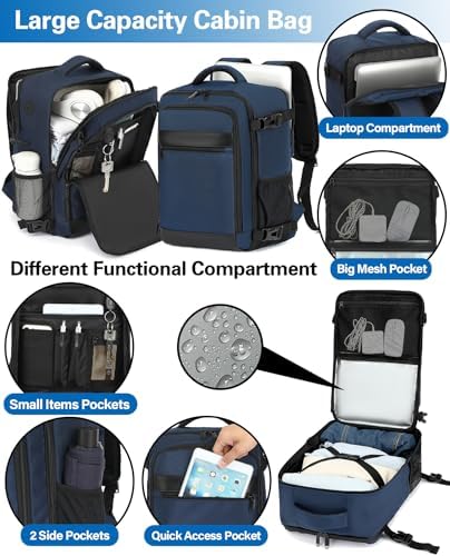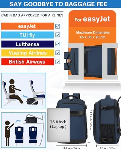 【Great Size Travel Cabin Bag for Easyjet】- Our cabin bag is designed to comply with Easyjet's carry-on luggage regulations, with a size of 45x36x20cm and a capacity of 30L. It fits for underseat and the overhead bin perfectly, making it suitable for most major airlines such as Ryanair, EasyJet, New Easyjet, British Airways,Wizz Air,Eurowings,Qantas, Etihad, and more. 【Ample Storage And Organization】 - Despite its compact size, our cabin bag offers plenty of room for all your travel essentials. It features 4 compartments,1 separate laptop compartment for up to 15.6-inch laptop,1 spacious main compartment with compression strap for clothing and personal items,1 functional compartment for better storage,and 1 front quick access pocket for your phone or passport. Additionally, there are 2 mesh pockets for your water bottle and umbrella. 【Convenient Features】- Our cabin bag is thoughtfully designed with convenience in mind. It features a dedicated wet pocket within the main compartment, allowing for the separation of wet items. The sturdy top handle ensures easy carrying, while the four side buckle stripes provide enhanced stability and security. Additionally, an anti-theft back pocket to ensure the safety of your belongings. 【Durability and Long Last】 - Made of high-density, lightweight, and sturdy polyester material, our cabin bag is built to long last. The smooth zippers and water-resistant design provide added protection for your belongings, making it suitable for different days. And the cable hole design for convenient charger. 【Comfortable Back & Reduce Stress】 - Our cabin bag features a comfortable airflow back design with thick and soft multi-panel ventilated padding, offering maximum comfort during your travels. The wide, breathable, and adjustable shoulder straps with foam padding relieve shoulder stress. Whether you're using it as a carry-on bag, travel backpack, laptop backpack, or for everyday use, it's the perfect choice for a comfortable and versatile travel companion.